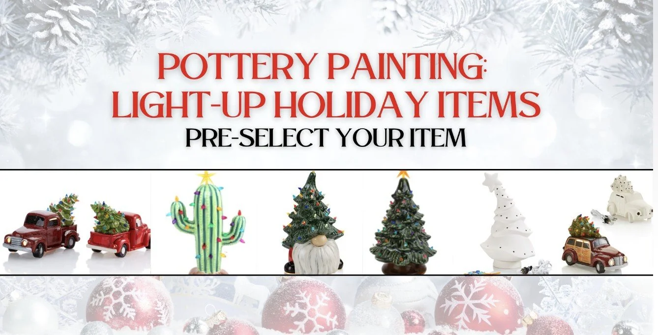 lncluded in your ticket price is your ceramic item, first beverage on us, over 20 different glaze colors, use of brushes, instruction, firing, glazing and delivery of finished piece back to the event location within 10-12 days.
