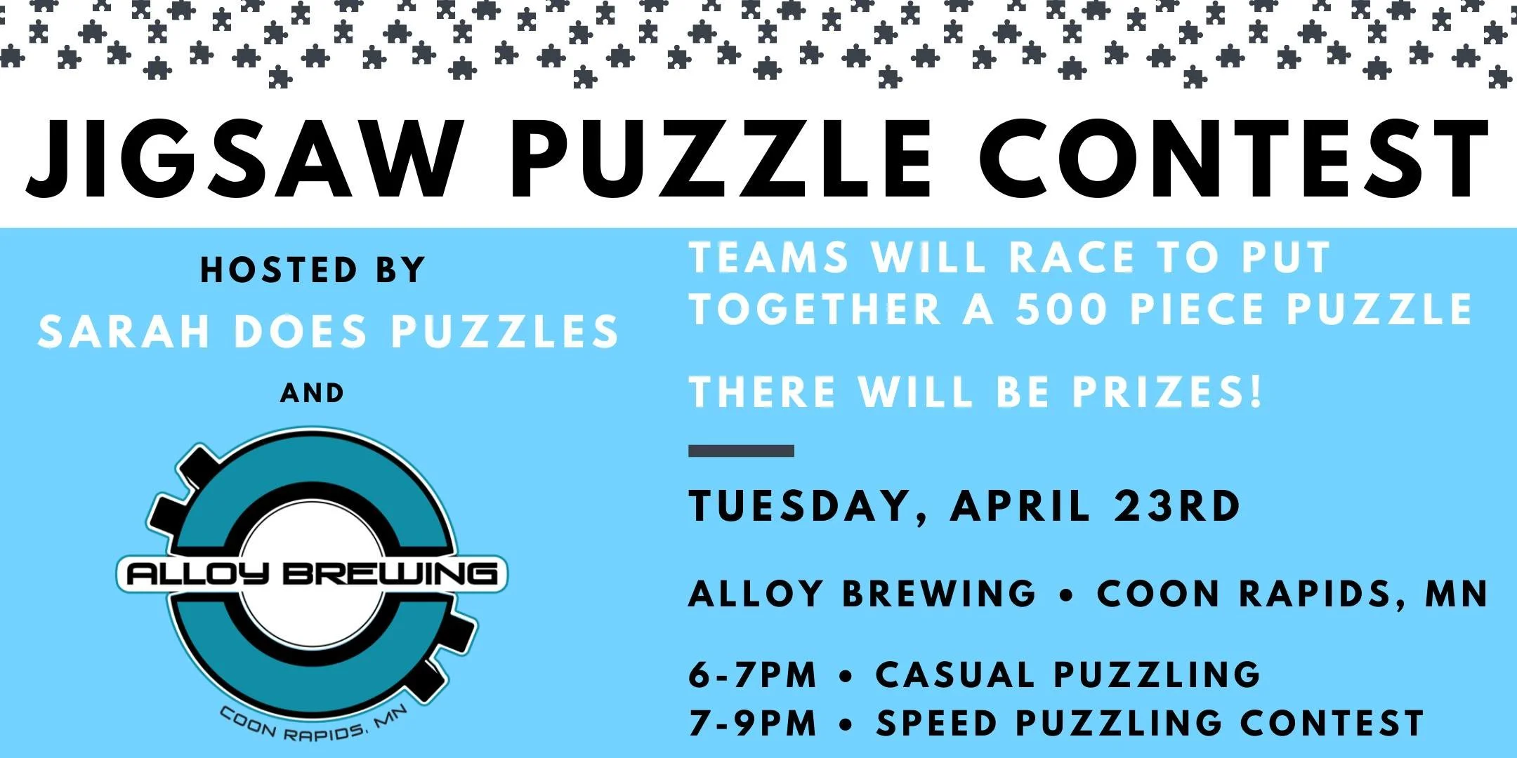 Each team will receive the same puzzle concealed in a bag. No one will see the puzzle before the timer starts. After a countdown, teams will open their boxes and start puzzling. A competition judge will monitor teams and record finishing times. Once you have completed your puzzle, you may leave, or stay and work on another puzzle and enjoy a drink or two!